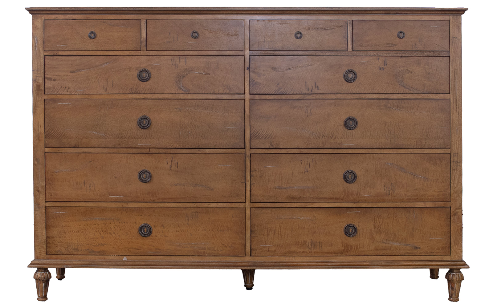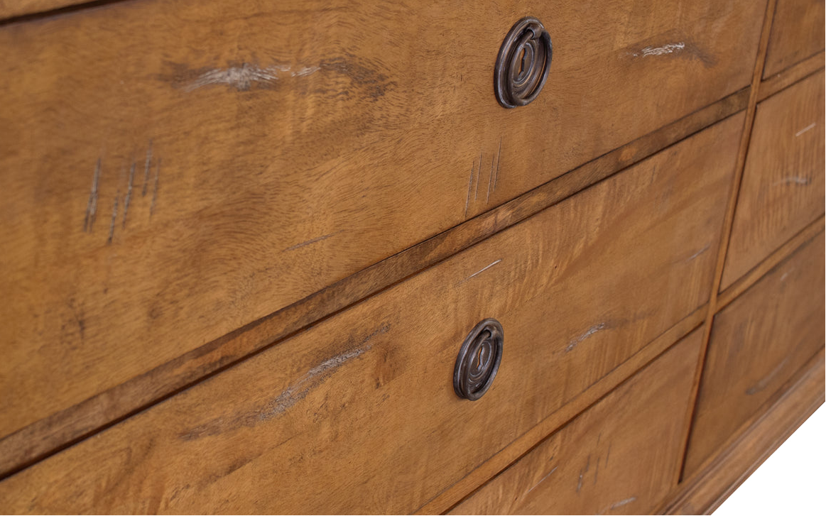 The Noble Crest Dresser brings warmth and functionality to any bedroom. Built from solid mango wood with brass hardware accents, this twelve-drawer piece combines rustic elegance with practical storage. English dovetail joinery and smooth ball bearing glides ensure lasting durability and effortless operation. The rich Beachwood finish adds timeless character while the sturdy construction makes it a reliable centerpiece for your space.