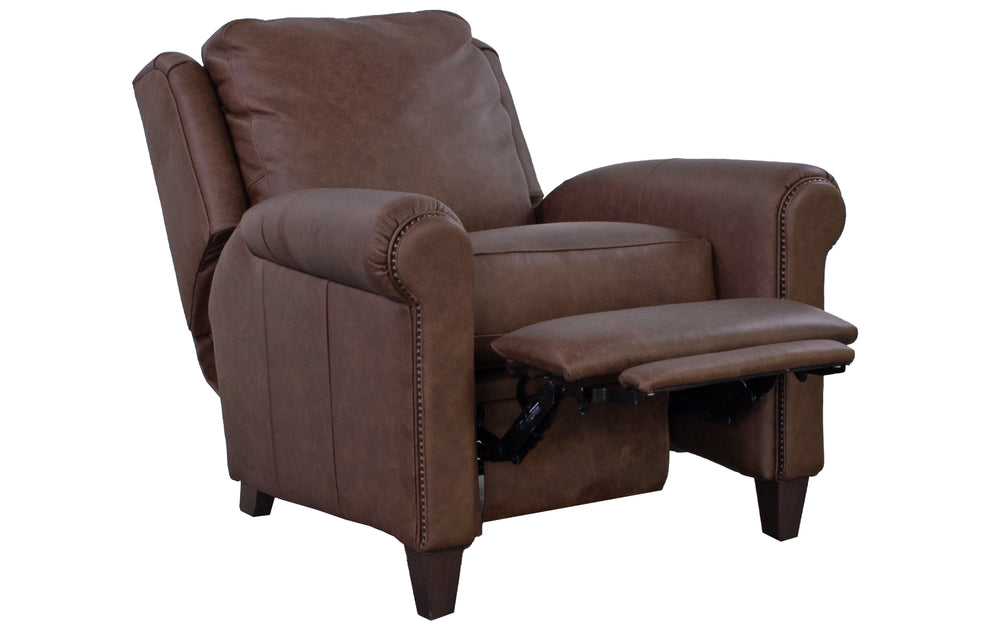 Experience luxury and comfort with the Smith Brothers Leather Push Back Recliner. Made in the USA with grade 1 leather, this recliner features a pillow back cushion and rubbed bronze nailhead detail. Relax and unwind in style.