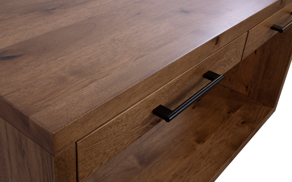 Update your living space with our Rustic Hickory Sofa Table. Its modern design and sharp edges add a contemporary touch to any room. Personalize it with your choice of wood species and stain color for a truly unique piece. Bring both style and functionality to your home with this end table.