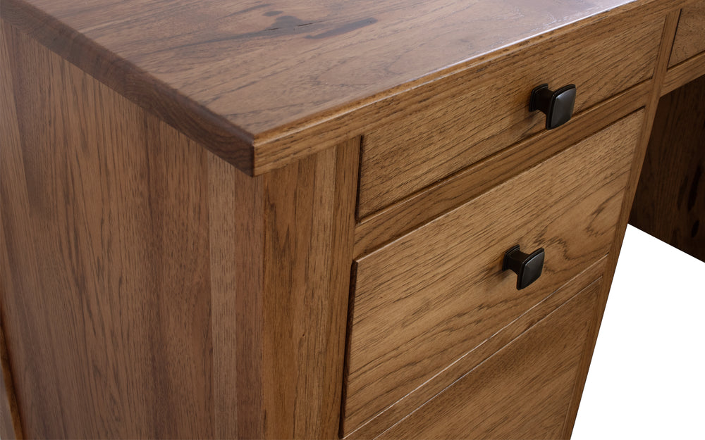 Upgrade your workspace with our Amish-made Rustic Hickory Desk. The finished back gives you freedom to place it anywhere in the room. Choose from a variety of wood species, stain colors, and hardware options to make it uniquely yours. Get the perfect combination of style and function.