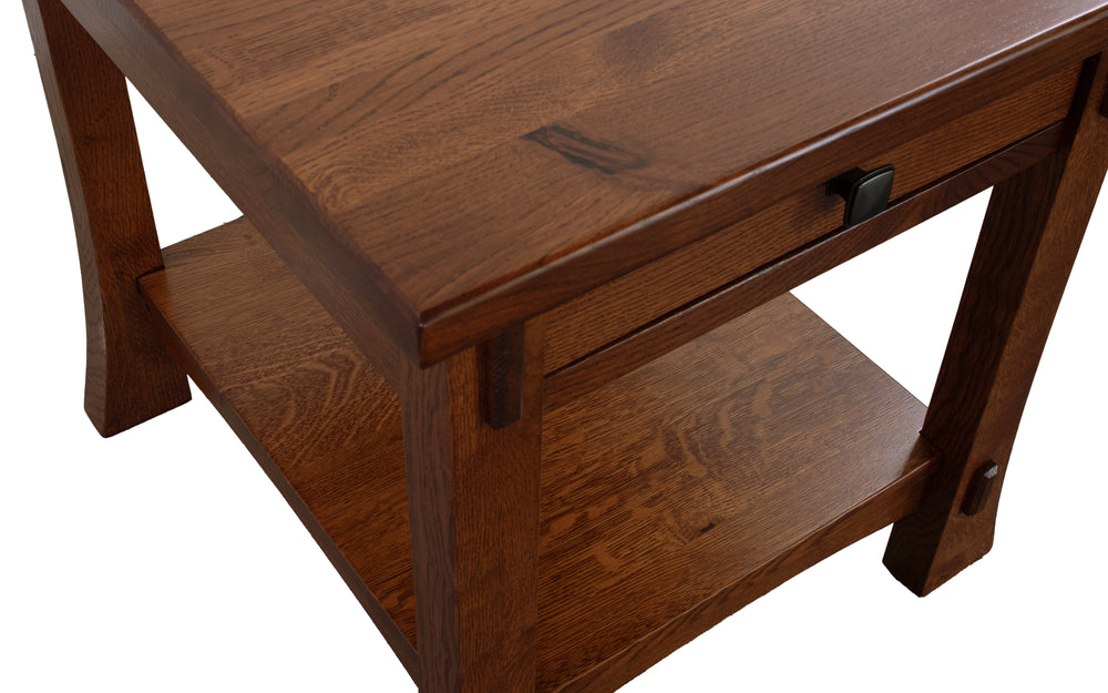 Elevate your living room with our Rustic Quartersawn White Oak End Table. Crafted in the classic mission style by skilled Amish artisans, this end table brings a touch of both tradition and elegance to your home. With the ability to customize the wood species, stain color, and hardware, you can create a unique piece that perfectly fits your style and space.