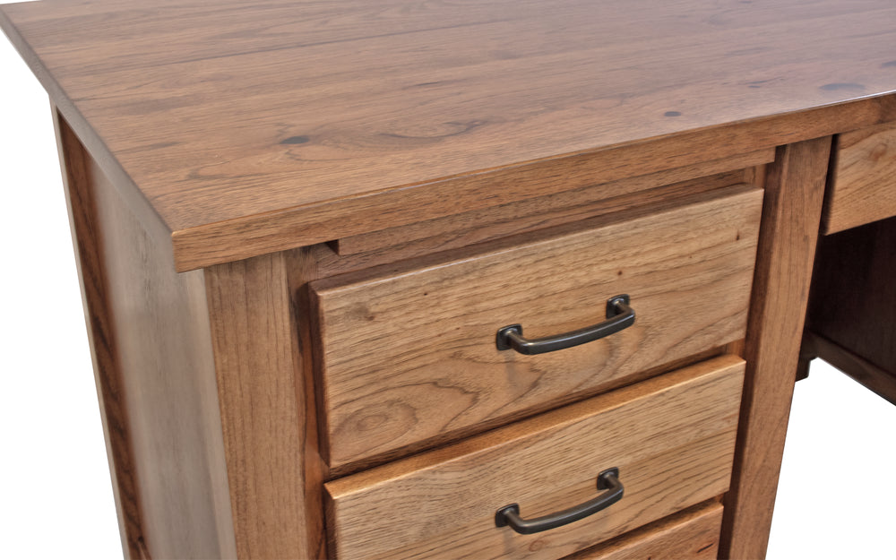 Upgrade your home office with our Rustic Hickory Desk. Hand-crafted by Amish artisans, this desk boasts a finished back, hidden keyboard drawer, and customizable options for wood species, stain color, and hardware. Work in style and comfort with this premium piece of furniture.