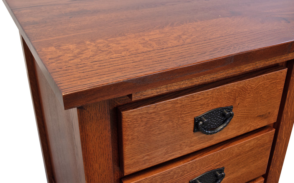 Upgrade your home office with our Quartersawn Hard White Oak Desk. Hand-crafted by Amish artisans, this desk boasts a finished back, hidden keyboard drawer, and customizable options for wood species, stain color, and hardware. Work in style and comfort with this premium piece of furniture.