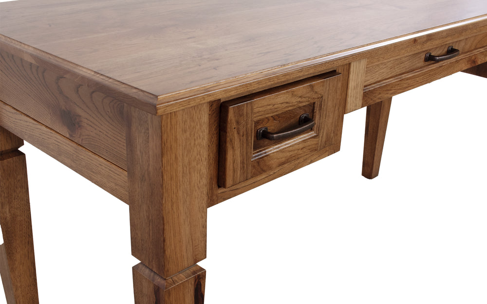 Crafted from solid wood, this Rustic Hickory Desk features detailed legs and extra deep drawers, providing ample storage and sturdy support. Customize the wood species, stain color, and hardware to perfectly match your style and workspace needs. Designed to combine durability with personalized charm, it’s an ideal choice for a functional and inviting home office.