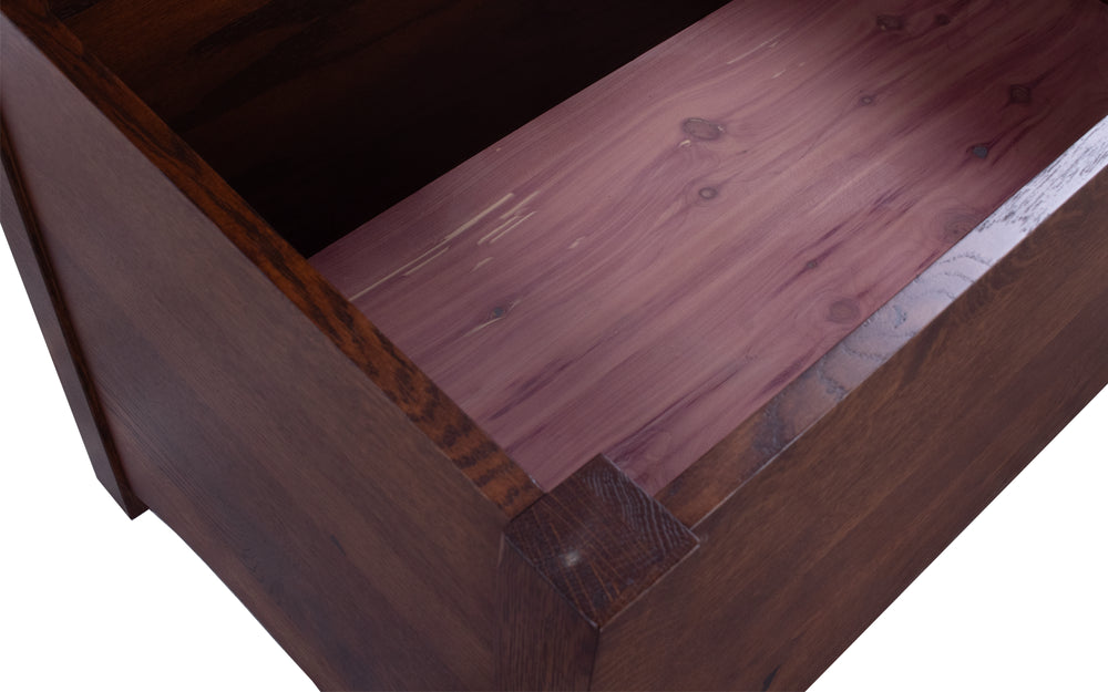 The Rustic Quartersawn White Oak Blanket Chest is expertly handcrafted by Amish artisans. Its cedar bottom ensures your belongings stay fresh. Customize the size, wood species, and stain color to suit your needs. Versatile and sturdy, this chest is a must-have in any home.
