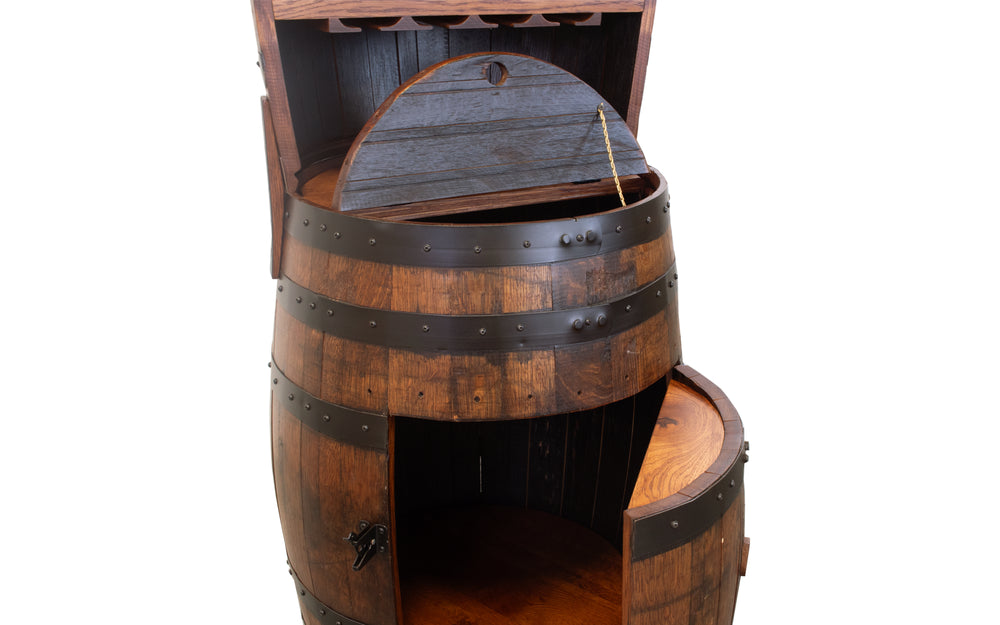 Expertly handcrafted from recycled barrels by skilled Amish artisans, the Barrel Hutch & Wine Rack offers a unique and eco-friendly addition to your home. Complete with wine glass racks and ample storage space, this one-of-a-kind piece seamlessly combines style and functionality. Elevate your kitchen or dining room with this exceptional collection.