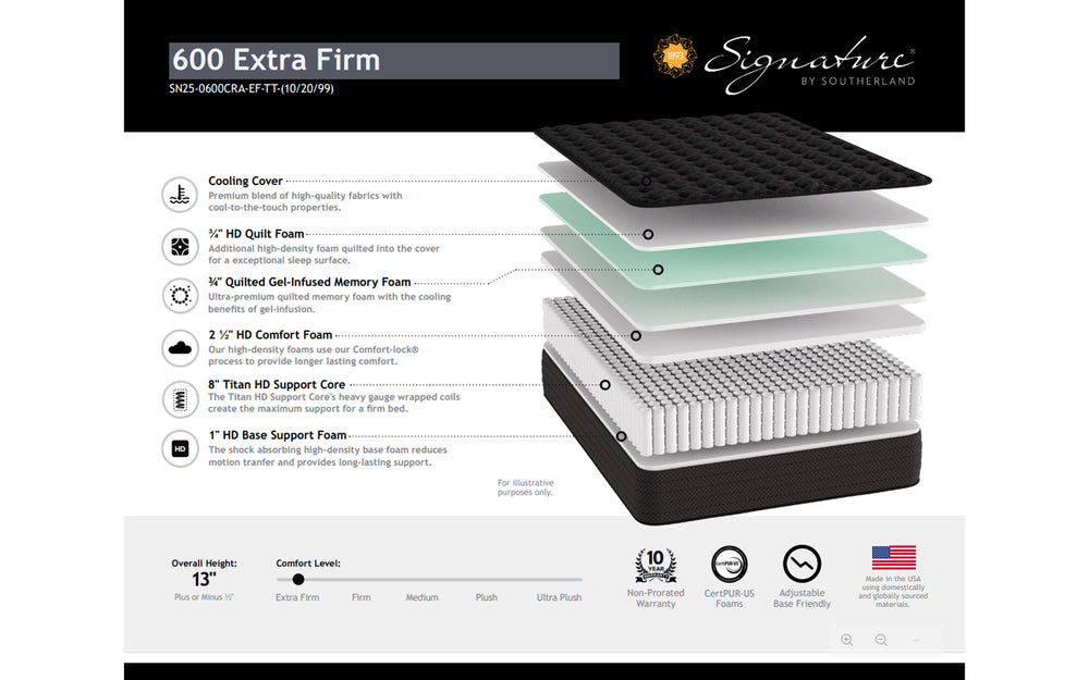 Experience restful nights with the Southerland 600 Extra Firm Mattress, designed to provide exceptional support and comfort. Featuring a cooling cover and three layers of foam, it helps regulate temperature for a cooler sleep environment. The 8-inch Titan HD core offers durable, extra-firm support to maintain proper spinal alignment throughout the night. Ideal for those seeking a mattress that combines firmness with advanced cooling technology for a refreshing and supportive sleep experience.