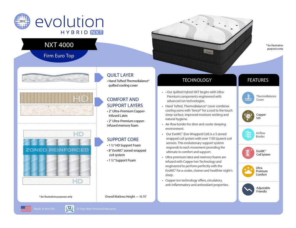 The quilted Hybrid NXT begins with Ultra-Premium components engineered with advanced ion technologies. Hand Tufted, ThermoBalance® cover combines cooling yarns with Tencel® for a cool-to-the-touch sleep surface, improved moisture-wicking, and natural hygiene. Air-flow border for a drier and cooler sleeping environment. EvoWC5 (Evo Wrapped Coil) is a 5-zoned wrapped coil system providing ultimate comfort and support. Ultra-premium latex and memory foams infused with Copper Ion Technology for a cooler, cleaner, and healthier sleep. Copper ion technology offers circulatory, anti-inflammatory, and antioxidant properties.
