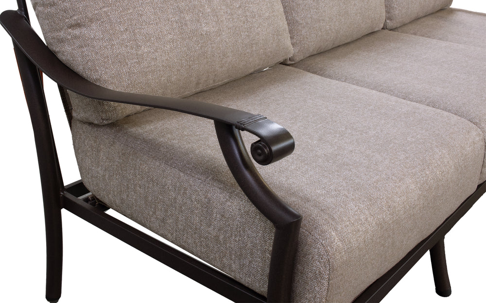 Deep, generously proportioned cushioned outdoor patio sofa truly bring the elegance and comfort of the indoors out, allowing yards or patios to become an elegant outdoor room. This sofa has generous seating surfaces to provide an elegant, yet rustic, charm.