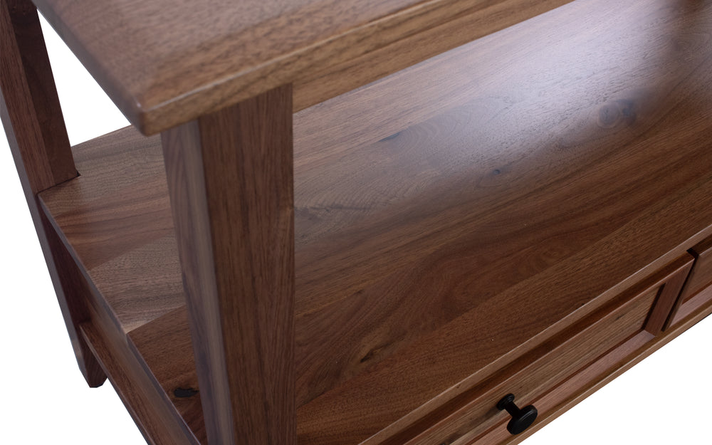 Expertly crafted by Amish artisans, this Rustic Walnut Sofa Table with 2 convenient drawers for storage. Customize the wood species, stain color, and hardware to fit your desired aesthetic. Made of solid walnut, it combines functionality and beauty for any living space.